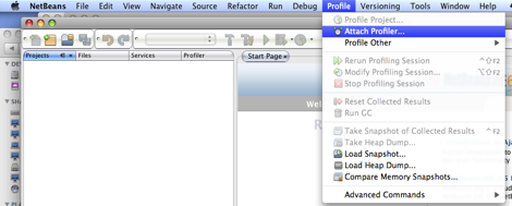 To get started, launch Netbeans and select Attach Profiler from the Profile menu.
