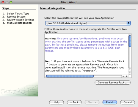 On this screen you will want to Generate Remote Pack before clicking finish. Clicking the remote pack button will generate a zip file that you will deploy on your windows box. It contains two jar files and a platform specific DLL. By default Netbeans saves the remote pack to an obscure directory under /tmp. I recommend picking a location that is easier to find.