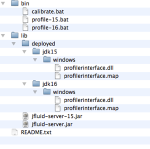 If you expand the pack you will see the files below. Running the bat files on windows assumes that java.exe is in your path and that JAVA_HOME is set. To profile an application with a 1.5 JVM you would use the profile-15.bat. To profile with 1.6 you would obviously use the profile-16.bat file. You use the bat files as a replacement for typing java at the command line. So to profile foo in bar.jar you would type profile-15.bat -classpath bar.jar foo.